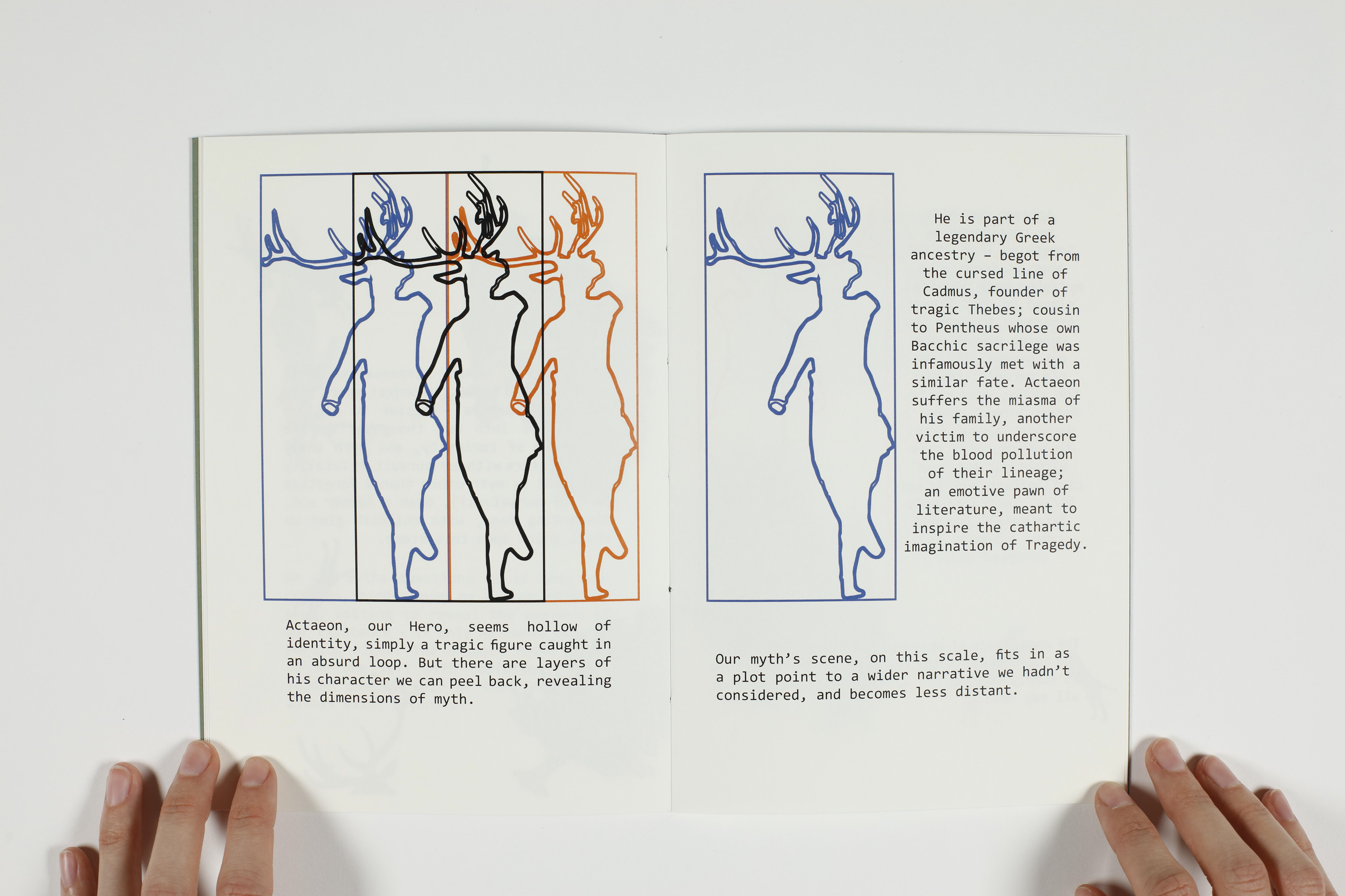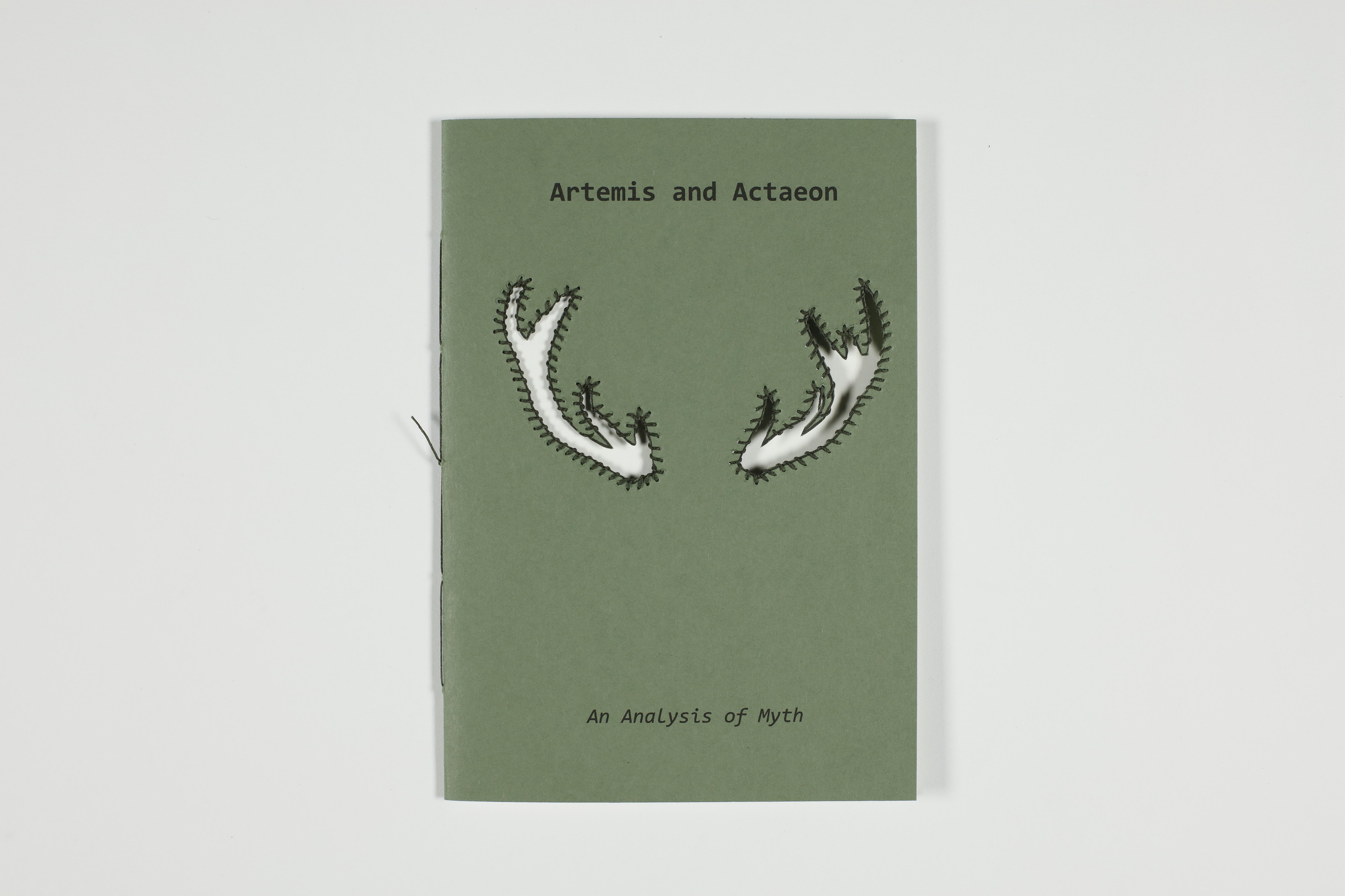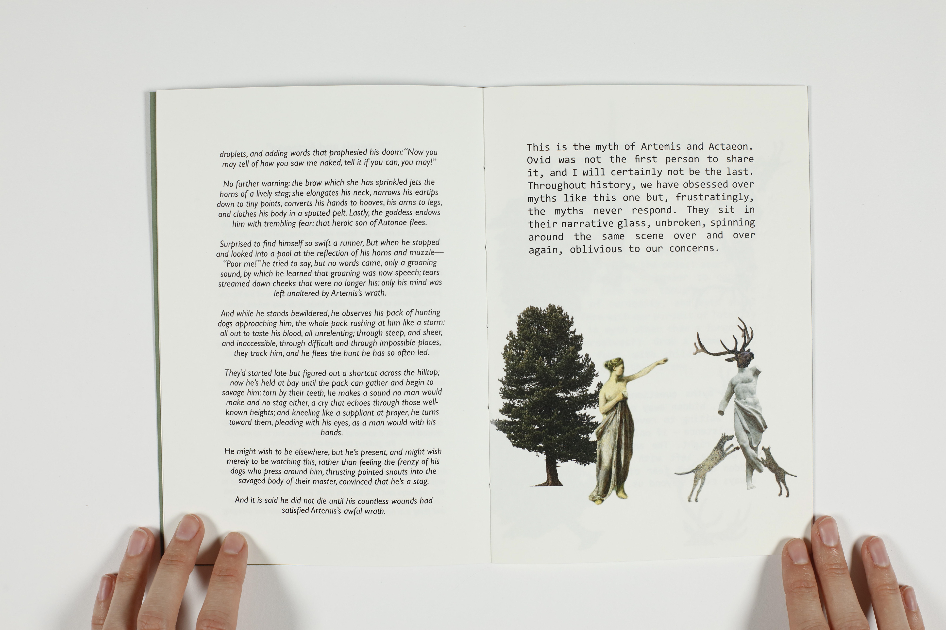 This is a short zine that I wrote and made for my MA at the London College of Communications. It explores the myth of Artemis and Actaeon, primarily the version told in Ovid’s Metamorphosis, through the lens of Object-Oriented Ontology. I wrote the text and designed the images for this zine, printed the inside digitally and the cover on a risograph. I hand-bound the book with thread, and designed the original cover to have a cut-out overlay on top of the inner title page.