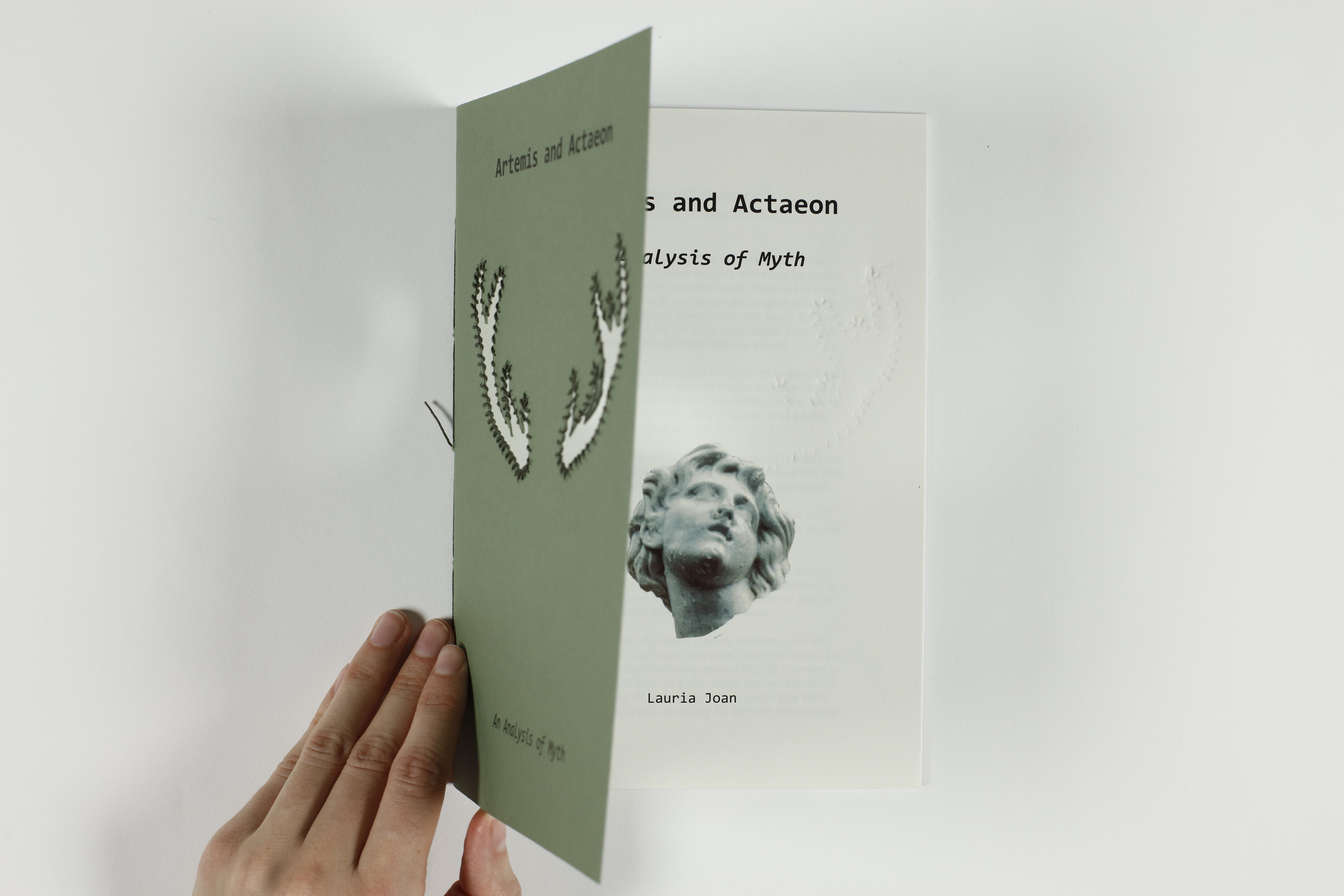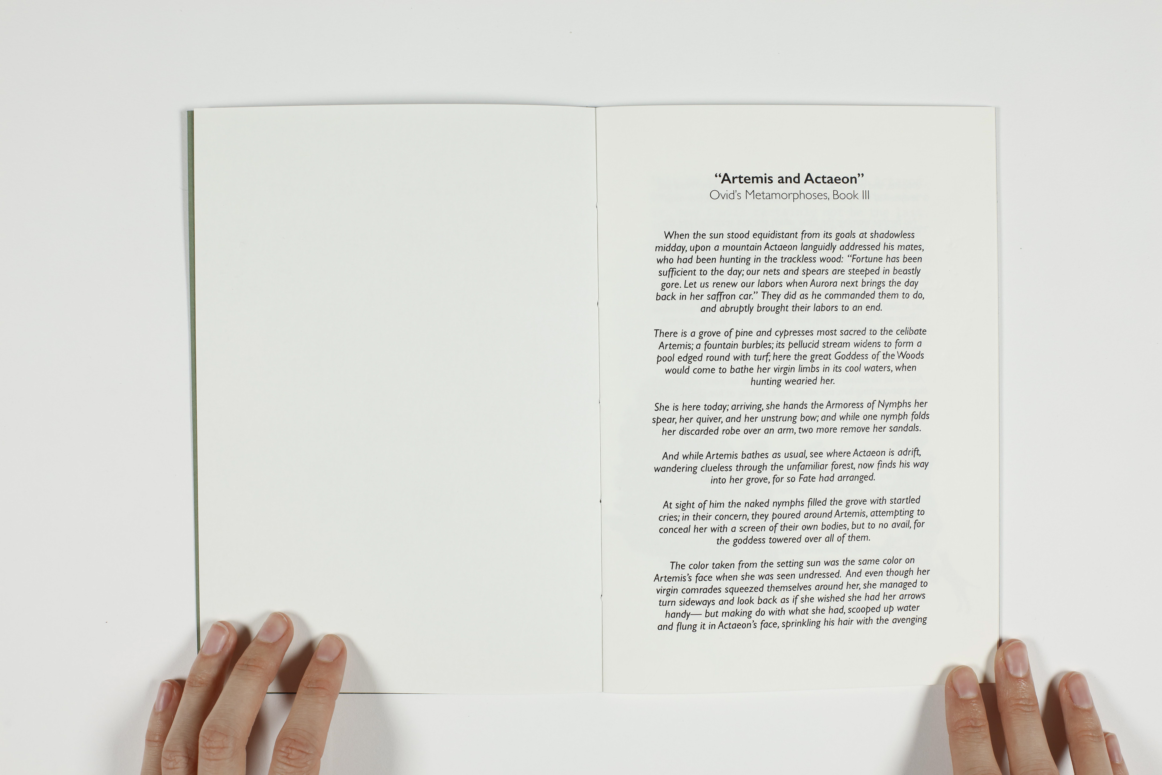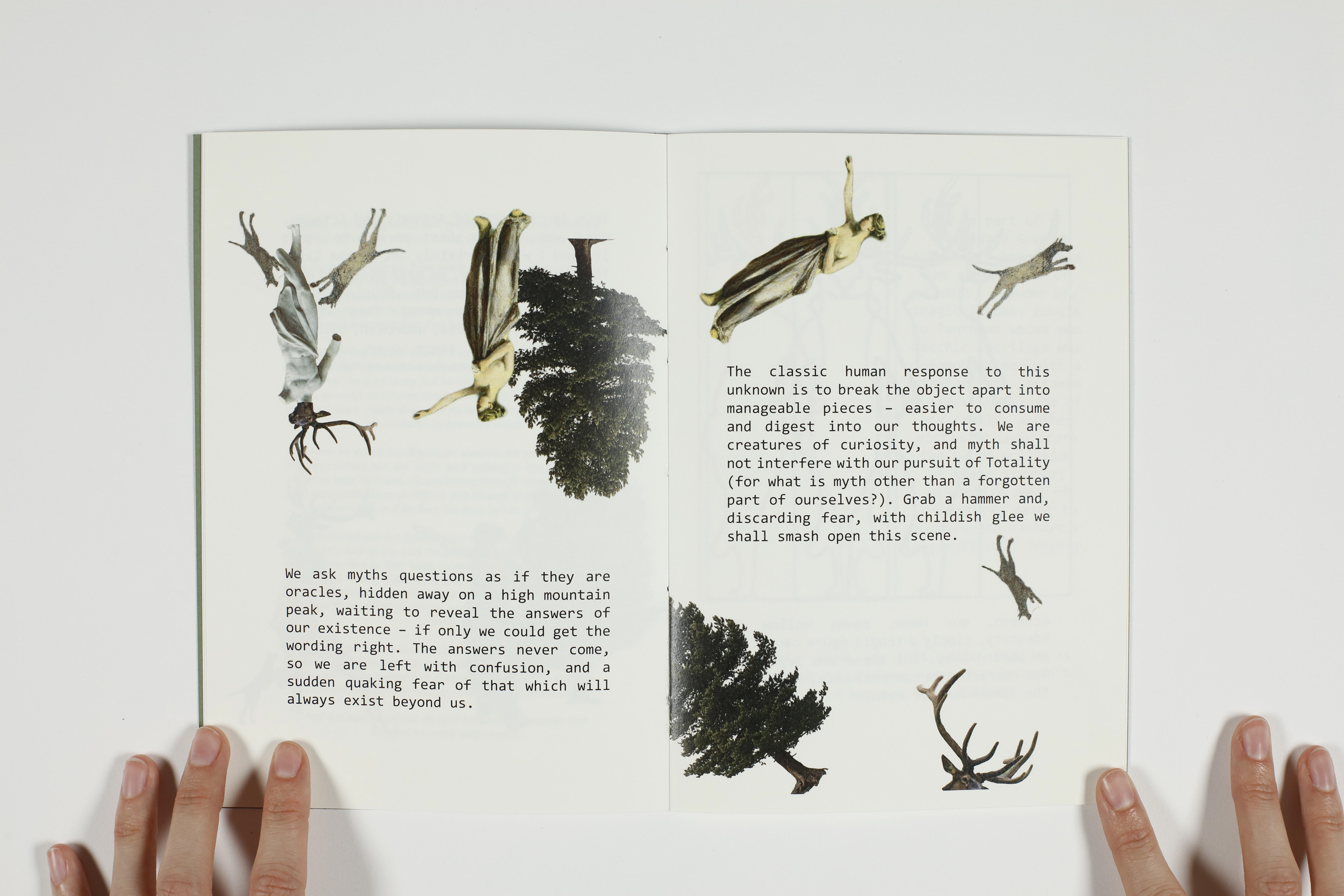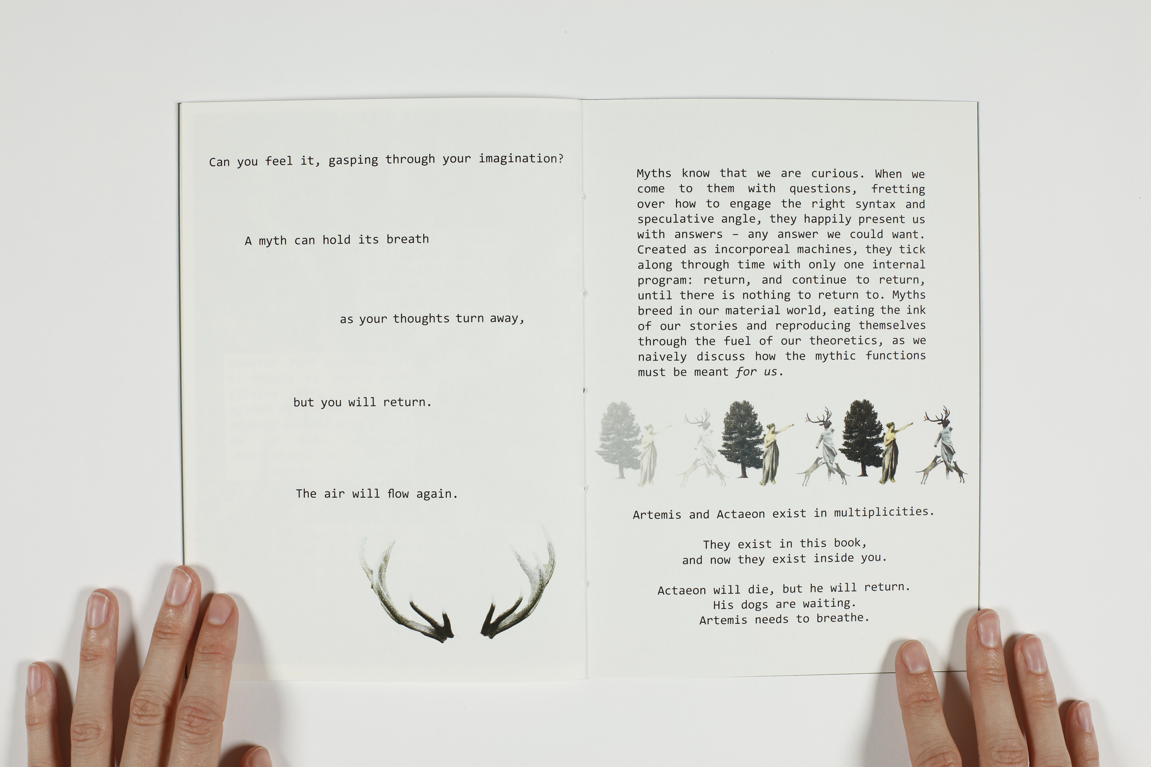 This is a short zine that I wrote and made for my MA at the London College of Communications. It explores the myth of Artemis and Actaeon, primarily the version told in Ovid’s Metamorphosis, through the lens of Object-Oriented Ontology. I wrote the text and designed the images for this zine, printed the inside digitally and the cover on a risograph. I hand-bound the book with thread, and designed the original cover to have a cut-out overlay on top of the inner title page.